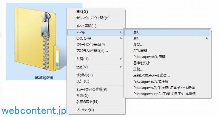 解凍したいファイルを右クリックし、「7-Zip」から「開く」を選択します。
