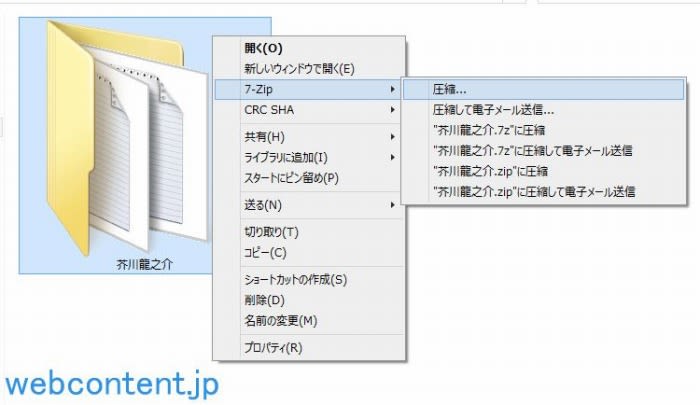 圧縮したいファイル(フォルダ)を右クリックし、「7-Zip」の「圧縮…」を選択します。