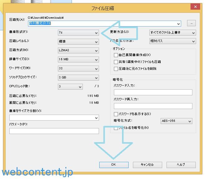 7-Zipは圧縮時のオプションとして次世代暗号化標準「AES-256bit」を利用した暗号化に対応しています。