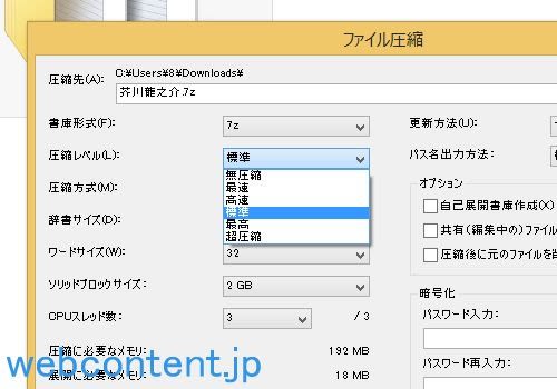 圧縮レベルを上げると圧縮後のファイルサイズを小さくすることができますが、その分圧縮・解凍に掛かる時間も伸びる上、必要なメモリも増えるので目的に応じた圧縮レベルを選択することが重要です。