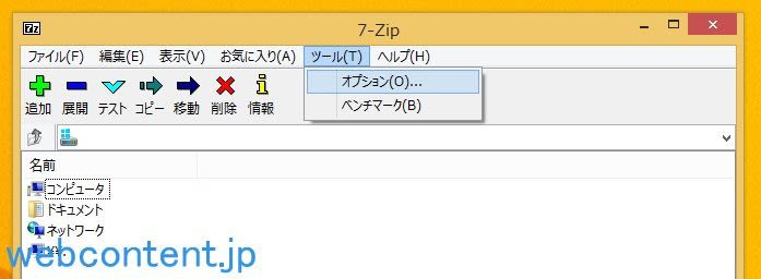 7-Zipを起動し、「ツール」から「オプション」を選択します。