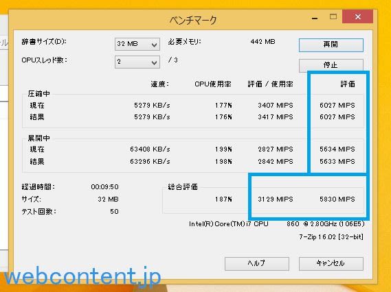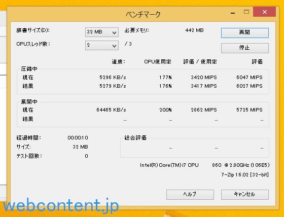 7-Zipはベンチマーク機能を内蔵しているため、パソコンの性能を比較することにも利用することができます。
