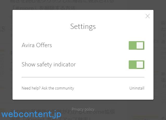 しかし、ブラウザ上部に小さく表示される通知バーを表示したくないなど設定を変更したい場合があるかもしれません。Avira Browser Safetyの設定画面は一見ないように見えますが、もちろんあります。