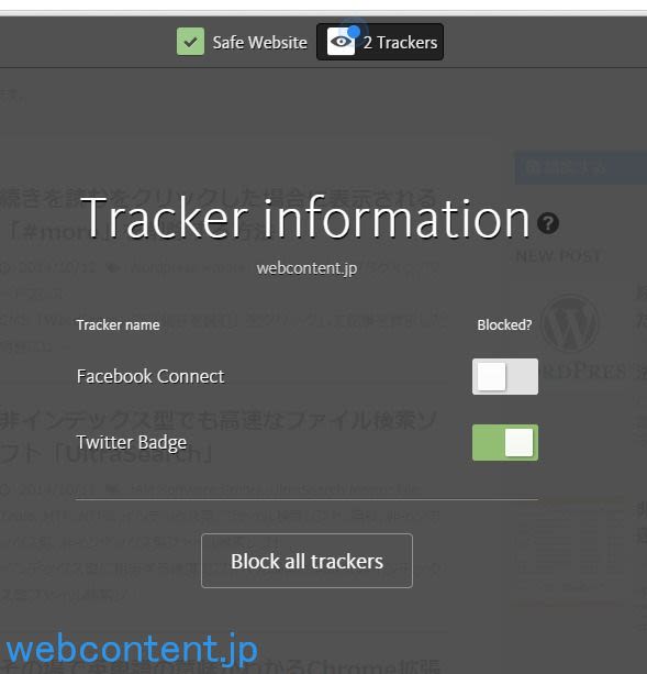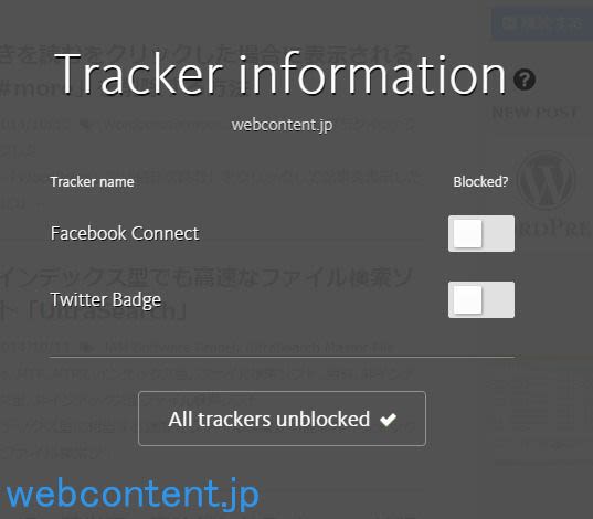 右側をクリックするとサイト内の存在するトラッキング情報が表示されます。画像の場合はFacebookとTwitterのトラッキングが存在しています。