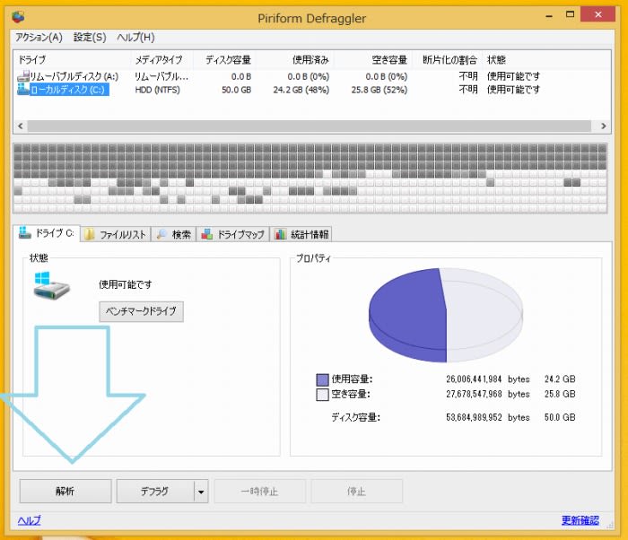 Defragglerはデフラグソフトです。基本的に「デフラグ」をクリックするだけで動作しますが、予めディスクの解析を行なうことで断片化の割合を確認することができます。