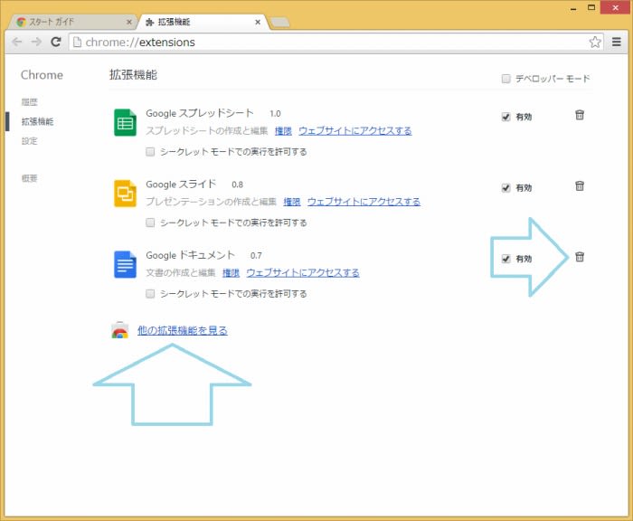 設定画面の拡張機能から有効・無効化、削除、追加をすることができます。