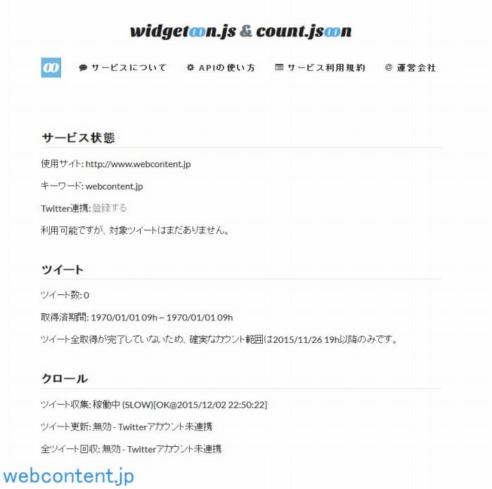 widgetoon.js & count.jsoonのユーザページではサービスの状況、ツイート状況、クロール状況を確認することができます