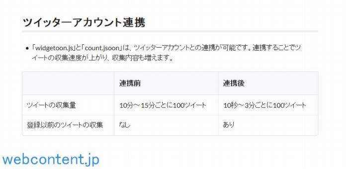 widgetoon.js & count.jsoon はサイトURLとメールアドレスを登録するだけで利用できますが、Twitterアカウントと連携することで更なる機能が提供されます。