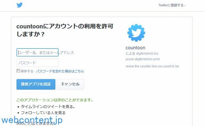 Twitterアカウントのユーザ名(もしくはメールアドレス)、パスワードを入力し、「連携アプリを認証」をクリックしてTwitterアカウントと連携します。