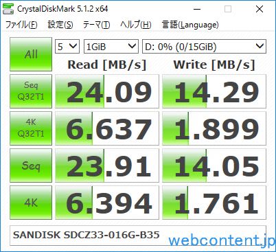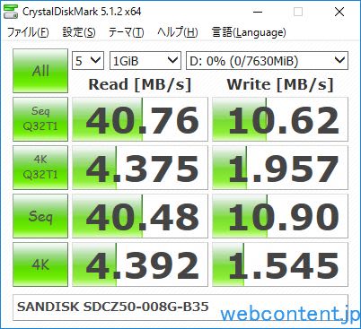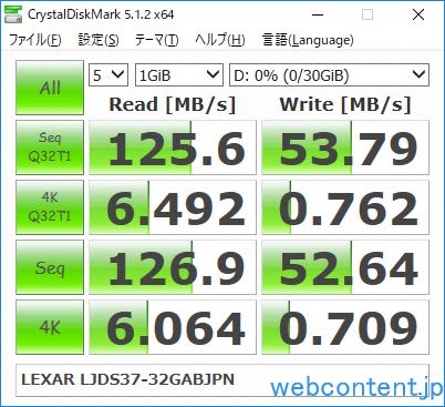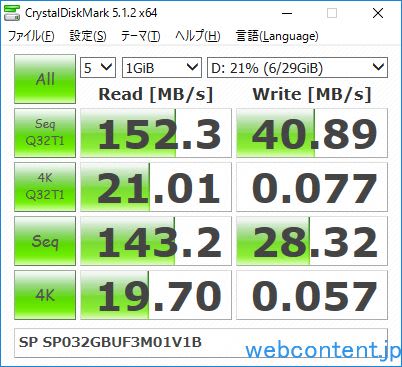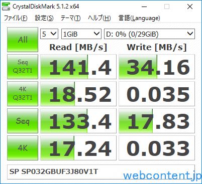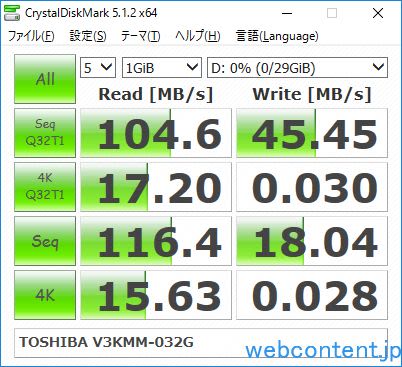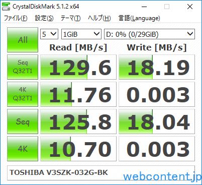 購入したのは32GBのV3SZK-032Gで、速度は画像の通りリードは十分高速ですがライトが遅くなっています。価格はそれに比例してか約900円とお買い得です。